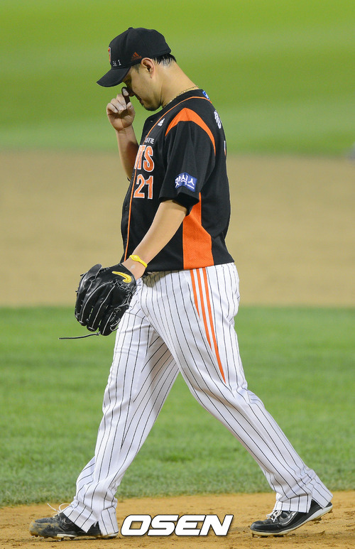 5회말 2사 1루에서 4실점을 허용한 롯데 선발 송승준이 마운드를 내려오고 있다.