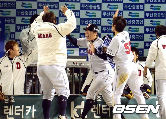 8일 오후 서울 잠실야구장에서 열린 2012 팔도프로야구 준PO1차전 두산 베어스와 롯데 자이언츠의 경기 5회말 2사 윤석민의 적시타로 홈을 밟은 김현수가 동료들의 환영을 받고 있다.