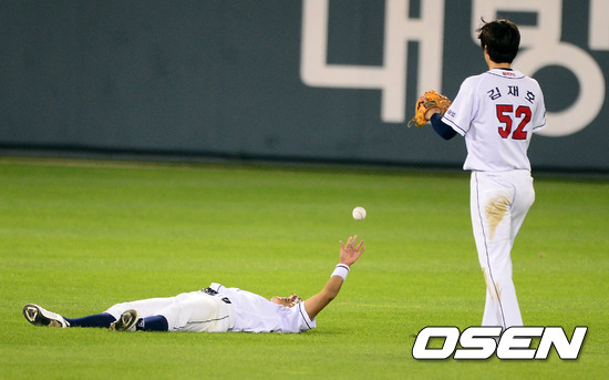 8일 오후 서울 잠실구장에서 열린 2012 팔도 프로야구 준플레이오프 1차전 두산 베어스(3위)와 롯데 자이언츠(4위)의 경기, 6회초 1사에서 두산 이종욱이 롯데 황재균의 안타성 타구를 몸날려 잡아내고 김재호에 볼을 넘겨주고 있다.