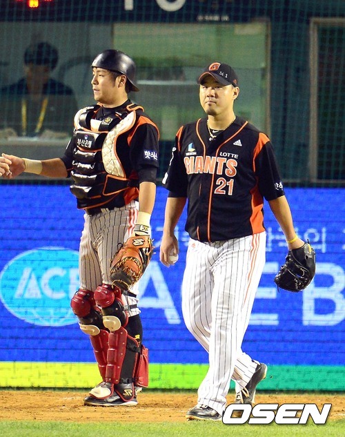 8일 오후 서울 잠실야구장에서 열린 2012 팔도프로야구 준PO1차전 두산 베어스와 롯데 자이언츠의 경기 5회말 2사 1,2루 송승준이 1루 견제미스로 동점골을 내주고 아쉬워 하고 있다.