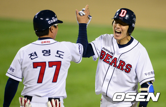 8일 오후 서울 잠실구장에서 열린 2012 팔도 프로야구 준플레이오프 1차전 두산 베어스(3위)와 롯데 자이언츠(4위)의 경기, 7회말 무사에서 두산 김재호가 우전안타를 날리고 기뻐하고 있다.