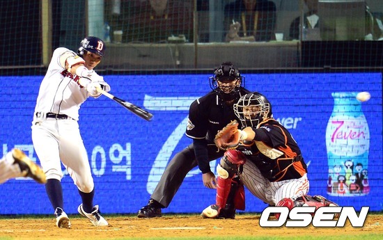 8일 오후 서울 잠실야구장에서 열린 2012 팔도프로야구 준PO1차전 두산 베어스와 롯데 자이언츠의 경기 5회말 2사 2루 이종욱이 적시타를 치고 있다.