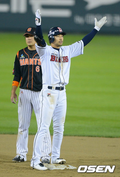 7회말 1사 2루 오재원 1타점 적시타를 날리고 2루에서 환호하고 있다.