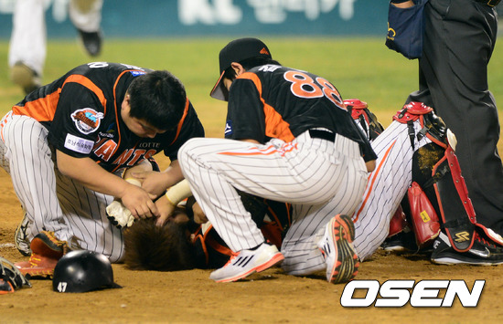 8일 오후 서울 잠실구장에서 열린 2012 팔도 프로야구 준플레이오프 1차전 두산 베어스(3위)와 롯데 자이언츠(4위)의 경기, 7회말 1사 2루에서 두산 오재원의 적시타에 롯데 강민호가 2루주자 두산 김재호와 충돌하고 그라운드에 누워 괴로워하고 있다.
