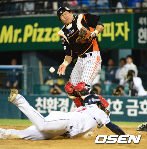 8일 오후 서울 잠실구장에서 열린 2012 팔도 프로야구 준플레이오프 1차전 두산 베어스(3위)와 롯데 자이언츠(4위)의 경기, 7회말 1사 2루 두산 오재원의 중전 적시타때 롯데 포수 강민호가 문규현의 불규칙 바운드 된 송구를 맞고 있다.