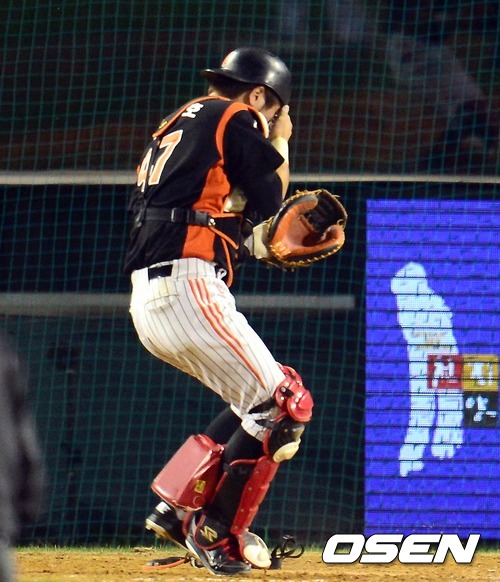 8일 오후 서울 잠실야구장에서 열린 2012 팔도프로야구 준PO1차전 두산 베어스와 롯데 자이언츠의 경기 7회말 1사 2루 오재원의 안타때 홈송구가 불규칙 바운드 돼 강민호의 얼굴을 강타하고 있다.