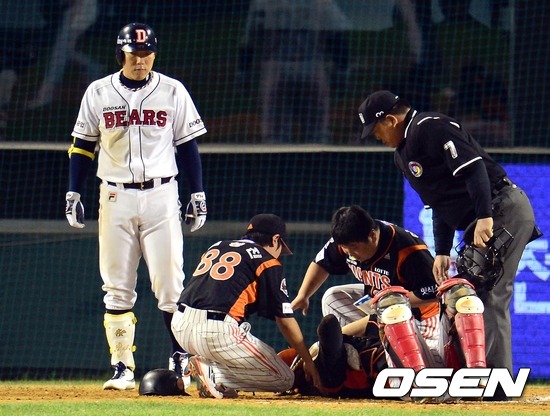 8일 오후 서울 잠실야구장에서 열린 2012 팔도프로야구 준PO1차전 두산 베어스와 롯데 자이언츠의 경기 7회말 1사 2루 오재원의 안타때 홈송구가 불규칙 바운드 돼 강민호의 얼굴을 강타, 쓰러진 강민호를 김현수가 안스러운 모습으로 바라보고 있다.