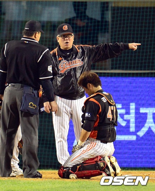 8일 오후 서울 잠실야구장에서 열린 2012 팔도프로야구 준PO1차전 두산 베어스와 롯데 자이언츠의 경기 7회말 1사 2루 오재원의 안타때 홈송구가 불규칙 바운드 돼 강민호의 얼굴을 강타, 양승호 감독이 교체를 지시하고 있다.