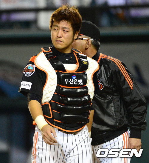 8일 오후 서울 잠실구장에서 열린 2012 팔도 프로야구 준플레이오프 1차전 두산 베어스(3위)와 롯데 자이언츠(4위)의 경기, 7회말 1사 2루 두산 오재원의 중전 적시타때 롯데 유격수 문규현의 불규칙 바운드를 맞은 포수 강민호가 교체되어 더그아웃으로 가고 있다.