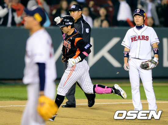 8일 오후 서울 잠실구장에서 열린 2012 팔도 프로야구 준플레이오프 1차전 두산 베어스(3위)와 롯데 자이언츠(4위)의 경기, 8회초 1사 1루에서 롯데 박준서가 동점 투런포를 날리고 기뻐하고 있다.
