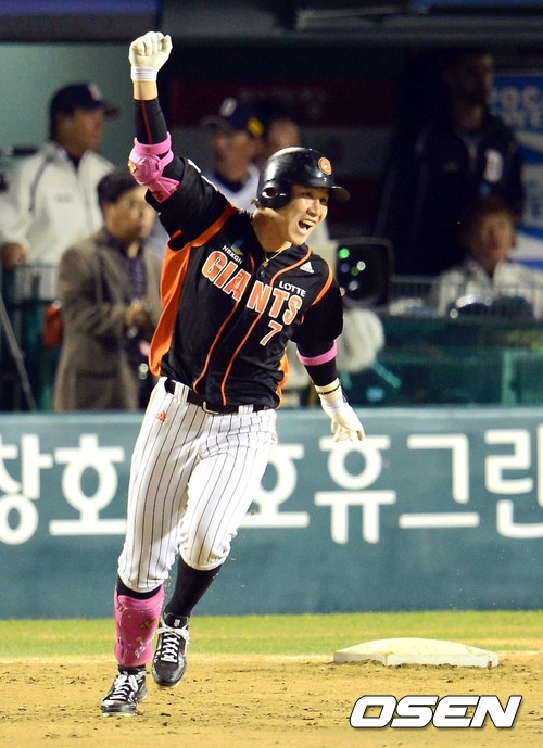 8일 오후 서울 잠실야구장에서 열린 2012 팔도프로야구 준PO1차전 두산 베어스와 롯데 자이언츠의 경기 8회초 1사 1루 박준서가 동점 투런 홈런을 날리고 환호하고 있다.
