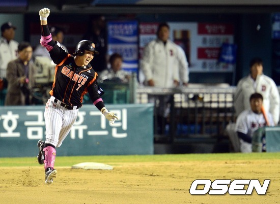 8일 오후 서울 잠실야구장에서 열린 2012 팔도프로야구 준PO1차전 두산 베어스와 롯데 자이언츠의 경기 8회초 1사 1루 박준서가 동점 투런 홈런을 날리고 환호하고 있다.