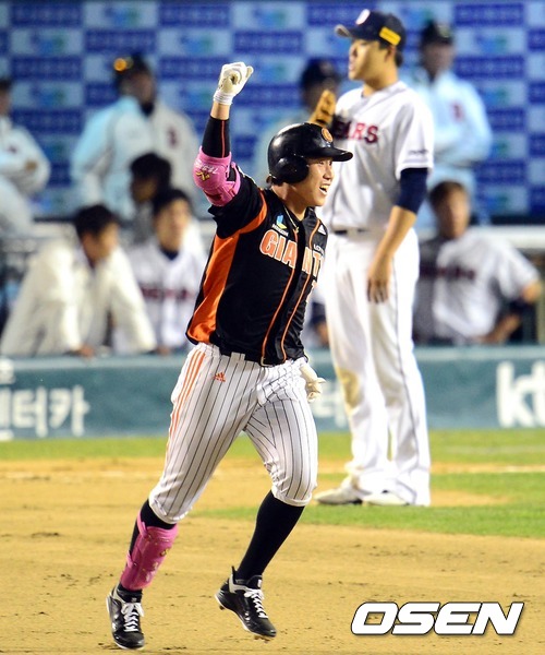 8일 오후 서울 잠실야구장에서 열린 2012 팔도프로야구 준PO1차전 두산 베어스와 롯데 자이언츠의 경기 8회초 1사 1루 박준서가 동점 투런 홈런을 날리고 환호하고 있다.