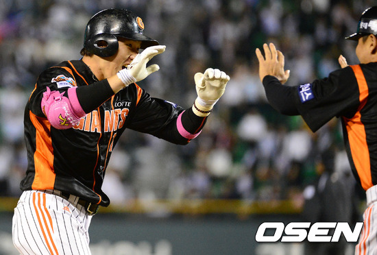 8일 오후 서울 잠실구장에서 열린 2012 팔도 프로야구 준플레이오프 1차전 두산 베어스(3위)와 롯데 자이언츠(4위)의 경기, 8회초 1사 1루에서 롯데 박준서가 우월 동점 투런홈런을 치고 환호하고 있다.