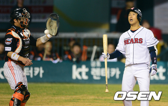 8일 오후 서울 잠실구장에서 열린 2012 팔도 프로야구 준플레이오프 1차전 두산 베어스(3위)와 롯데 자이언츠(4위)의 경기, 8회말 2사에서 두산 임재철이 볼넷으로 출루하고 있다.