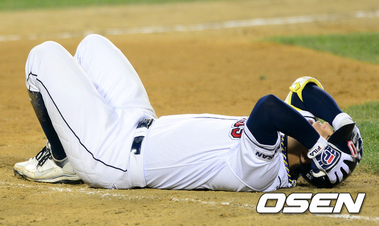 8일 오후 서울 잠실구장에서 열린 2012 팔도 프로야구 준플레이오프 1차전 두산 베어스(3위)와 롯데 자이언츠(4위)의 경기, 9회말 1사 1,2루에서 두산 김현수가 1루수 땅볼 병살로 물러나며 아쉬워하고 있다.