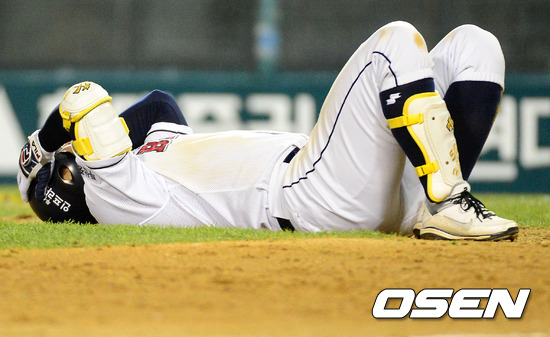 8일 오후 서울 잠실구장에서 열린 2012 팔도 프로야구 준플레이오프 1차전 두산 베어스(3위)와 롯데 자이언츠(4위)의 경기, 9회말 1사 2루 두산 김현수가 플라이 처리되며 동시에 1루주자 오재원을 아웃처리되자 그라운드에 누워 아쉬워하고 있다.