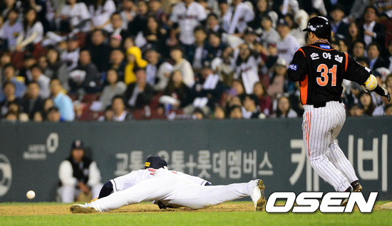 8일 오후 서울 잠실구장에서 열린 2012 팔도 프로야구 준플레이오프 1차전 두산 베어스(3위)와 롯데 자이언츠(4위)의 경기, 10회초 1사 2,3루 롯데 손아섭의 번트타구를 투수 김강률이 악송구하며 공이 빠지고 있다.