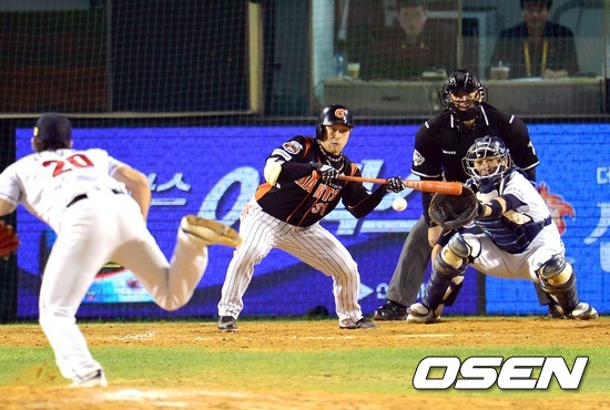 8일 오후 서울 잠실야구장에서 열린 2012 팔도프로야구 준PO1차전 두산 베어스와 롯데 자이언츠의 경기 10회초 1사 2,3루 손아섭이 스퀴즈 번트를 성공시키고 있다.