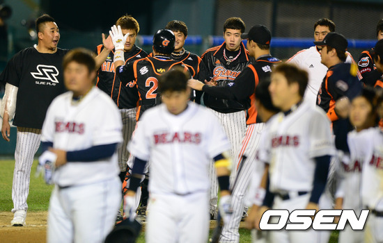 롯데가 승리의 하이파이브를 하는 반면 두산 선수들이 고개를 숙인채 그라운드를 나서고 있다. 1차전 승리팀이 플레이오프에 진출할 확률은 85.7%이다./jpnews@osen.co.kr