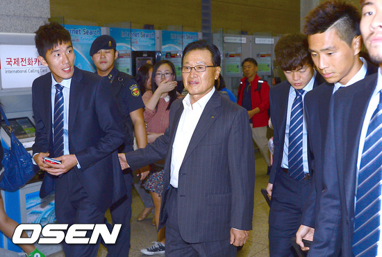 조중연 대한축구협회 회장이 출국하는 김정우를 격려하고 있다. / sou1l1014@osen.co.kr