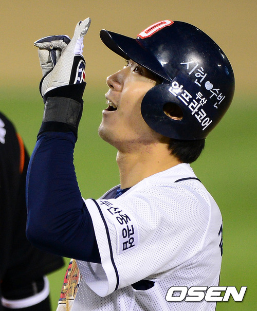 7회말 무사에서 안타를 날린 두산 김재호가 기뻐하고 있다. 헬멧에 부상으로 결장한 손시헌과 정수빈의 이름이 눈길을 끈. /jpnews@osen.co.kr