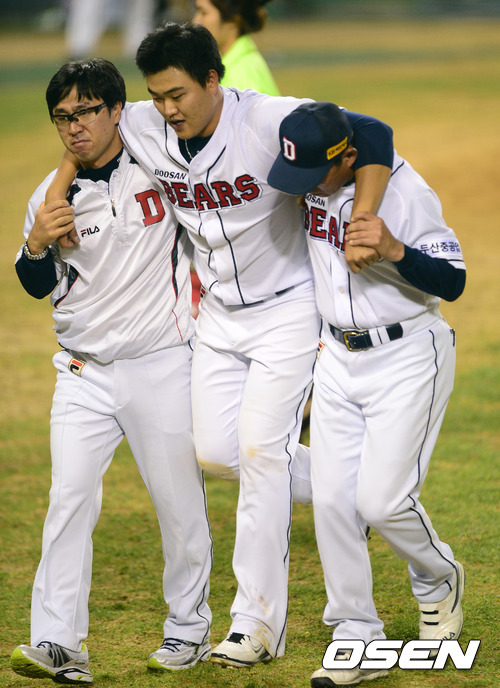 8일 롯데와의 준플레이오프 1차전에서 손아섭의 번트를 수비하던 도중 투수와 부딪히며 쓰러져 중도 교체된 두산 베어스 1루수 오재일(26)의 부상이 다행히 단순 타박상인 것으로 알려졌다.