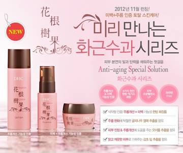 로션, 에센스, 크림 3종으로 구성된 DHC ‘화근수과’ 시리즈는 주름 완화에 탁월한 굴피나무 열매 추출물을 포함한 6가지 천연 한방 엑기스를 배합해 함유시킨 제품으로 주름개선과 미백 기능성 인증을 받은 토탈 스킨 케어 제품라인이다.