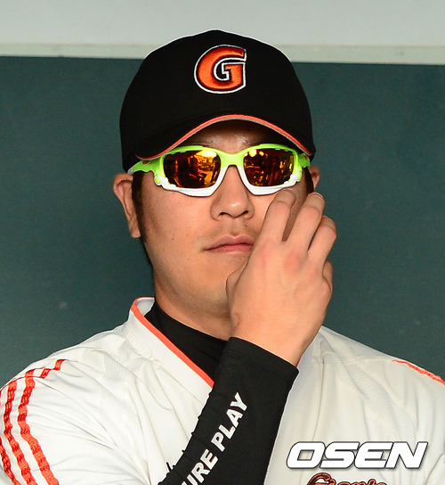 9일 오후 서울 잠실구장에서 열린 2012 팔도 프로야구 준플레이오프 2차전 두산 베어스와 롯데 자이언츠의 경기에 앞서 롯데 강민호가 더그아웃에서 취재진과 전날 경기에 대한 이야기를 나누고 있다. 강민호는 전날 경기 7회말 1사 2루 두산 오재원의 중전 적시타때 문규현의 불규칙 바운드 된 송구를 맞고 포수 용덕한과 교체됐다.