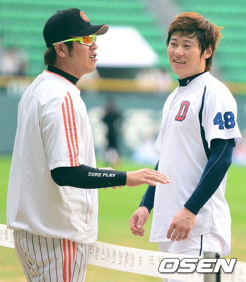 9일 오후 서울 잠실구장에서 열린 2012 팔도 프로야구 준플레이오프 2차전 두산 베어스와 롯데 자이언츠의 경기에 앞서 롯데 강민호가 두산 이원석과 이야기를 나누고 있다. 강민호는 전날 경기 7회말 1사 2루 두산 오재원의 중전 적시타때 문규현의 불규칙 바운드 된 송구를 맞고 포수 용덕한과 교체됐다.