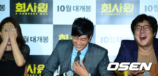 9일 오후 동대문 메가박스에서 열린 영화 '회사원' 언론 배급 시사회에서 이미연과 소지섭 곽도원이 환하게 웃고 있다.