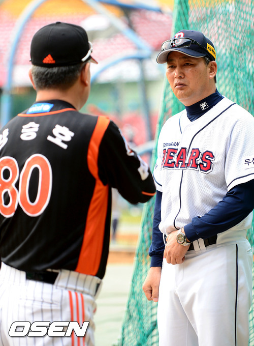 9일 오후 서울 잠실구장에서 열린 2012 팔도 프로야구 준플레이오프 2차전 두산 베어스와 롯데 자이언츠의 경기에 앞서 롯데 양승호 감독과 두산 김진욱 감독이 이야기를 나누고 있다.