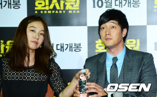 9일 오후 동대문 메가박스에서 열린 영화 '회사원' 언론 배급 시사회에서 이미연이 소지섭에게 물병을 주고 있다.