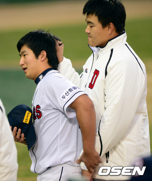 9일 오후 서울 잠실구장에서 열린 2012 팔도 프로야구 준플레이오프 2차전 두산 베어스와 롯데 자이언츠의 경기, 경기에 앞서 두산 오재일이 최재훈의 머리채를 잡고 장난을 치고 있다.