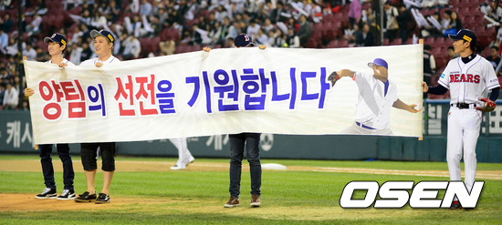 9일 오후 서울 잠실구장에서 열린 2012 팔도 프로야구 준플레이오프 2차전 두산 베어스와 롯데 자이언츠의 경기에 앞서 시구를 마친 그룹 슈퍼주니어 이특이 은혁, 신동과 함께 양팀의 선전을 기원하는 현수막을 들고 있다.