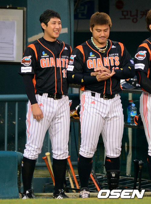 9일 오후 서울 잠실구장에서 열린 2012 팔도 프로야구 준플레이오프 2차전 두산 베어스와 롯데 자이언츠의 경기, 경기에 앞서 롯데 홍성흔이 황재균의 손을 잡고 장난을 치고 있다.