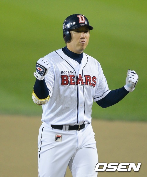 두산 1회말 1사 2루 김현수 선취 1타점 적시타를 날리고 환호하고 있다.