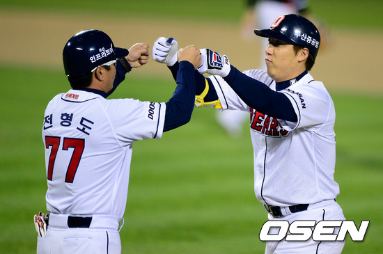 9일 오후 서울 잠실구장에서 열린 2012 팔도 프로야구 준플레이오프 2차전 두산 베어스와 롯데 자이언츠의 경기, 1회말 1사 2루에서 두산 김현수가 선제 1타점 적시타를 날리고 기뻐하고 있다.