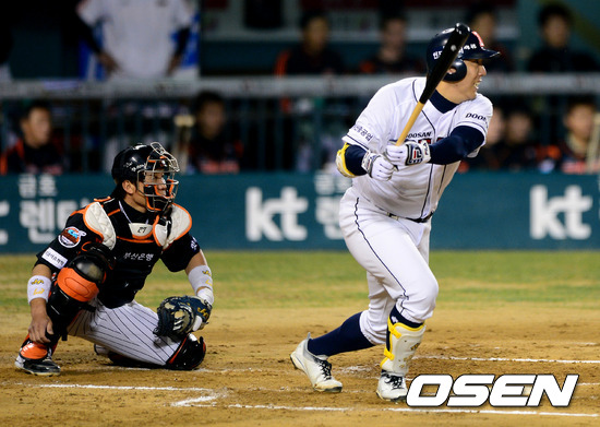9일 오후 서울 잠실구장에서 열린 2012 팔도 프로야구 준플레이오프 2차전 두산 베어스와 롯데 자이언츠의 경기, 1회말 1사 2루에서 두산 김현수가 선제 1타점 적시타를 날리고 타구를 바라보고 있다.