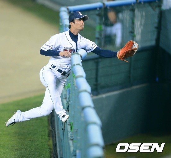 2회초 1사 전준우 1루 펜스 근처 파울타구를 두산 오재원 1루수가 몸을 던지는 수비를 펼치고 있다.