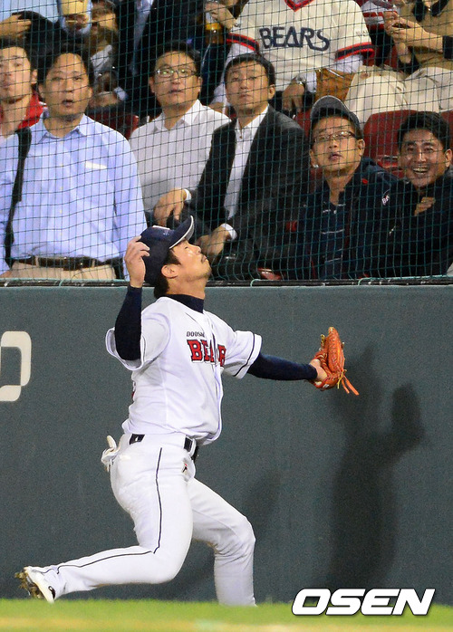 9일 오후 서울 잠실구장에서 열린 2012 팔도 프로야구 준플레이오프 2차전 두산 베어스와 롯데 자이언츠의 경기, 2회초 1사 두산 오재원이 롯데 전준우의 파울 타구를 잡고 있다.