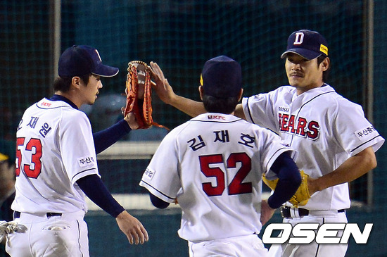 9일 오후 서울 잠실구장에서 열린 2012 팔도 프로야구 준플레이오프 2차전 두산 베어스와 롯데 자이언츠의 경기, 2회초 두산 노경은이 이닝을 마무리 짓고 더그아웃으로 들어가면서 야수들과 기뻐하고 있다.