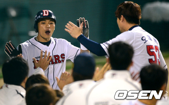 9일 오후 서울 잠실구장에서 열린 2012 팔도 프로야구 준플레이오프 2차전 두산 베어스와 롯데 자이언츠의 경기, 1회말 1사 2루에서 두산 김현수의 적시타에 홈을 밟은 이종욱이 2사에서 두산 노경은이 롯데 황재균의 내야땅볼을 처리하고 더그아웃에서 동료선수들의 축하를 받고 있다.