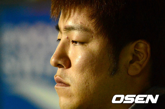 9일 오후 서울 잠실구장에서 열린 2012 팔도 프로야구 준플레이오프 2차전 두산 베어스와 롯데 자이언츠의 경기, 롯데 강민호가 더그아웃에서 경기를 바라보고 있다. 강민호는 전날 경기 7회말 1사 2루 두산 오재원의 중전 적시타때 문규현의 불규칙 바운드 된 송구를 맞고 포수 용덕한과 교체됐다.