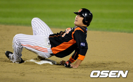 9일 오후 서울 잠실구장에서 열린 2012 팔도 프로야구 준플레이오프 2차전 두산 베어스와 롯데 자이언츠의 경기, 3회초 1사 1루에서 2루 도루에 실패한 롯데 문규현이 아쉬운 표정을 짓고 있다.