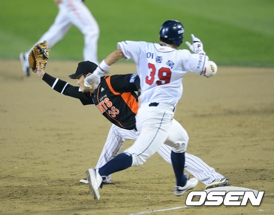 3회말 선두타자 이종욱 3루수앞 땅볼치고 1루까지 전력 진루하였으나 아웃 처리되고 있다.