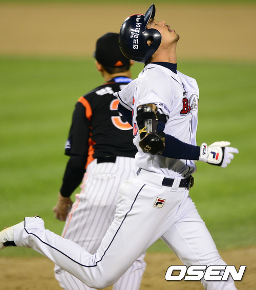 9일 오후 서울 잠실구장에서 열린 2012 팔도 프로야구 준플레이오프 2차전 두산 베어스와 롯데 자이언츠의 경기, 3회말 1사에서 두산 오재원이 내야땅볼로 아웃당하고 아쉬워하고 있다.