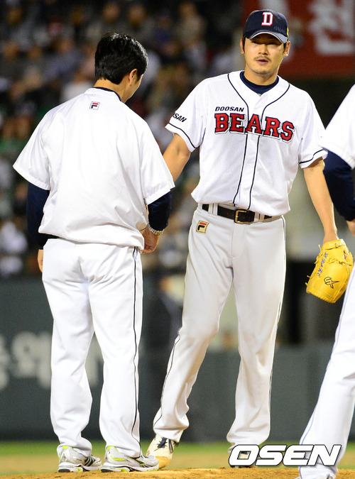 9일 오후 서울 잠실구장에서 열린 2012 팔도 프로야구 준플레이오프 2차전 두산 베어스와 롯데 자이언츠의 경기, 4회초 2사 1루 롯데 박종윤의 타구를 맞은 두산 노경은이 트레이너에게 상태를 보이고 있다.
