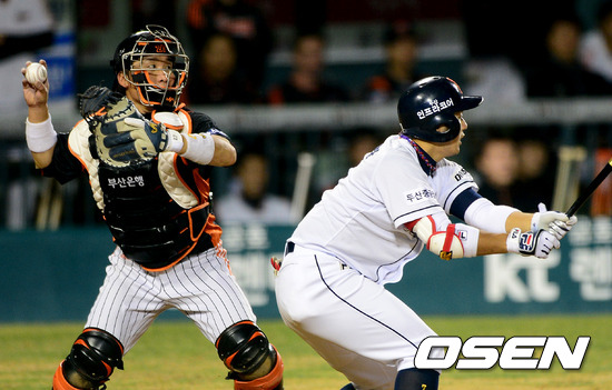 9일 오후 서울 잠실구장에서 열린 2012 팔도 프로야구 준플레이오프 2차전 두산 베어스와 롯데 자이언츠의 경기, 4회말 1사 1루에서 두산 최주환 타석에 이원석이 도루를 시도하자 롯데 용덕한이 2루로 송구하고 있다.