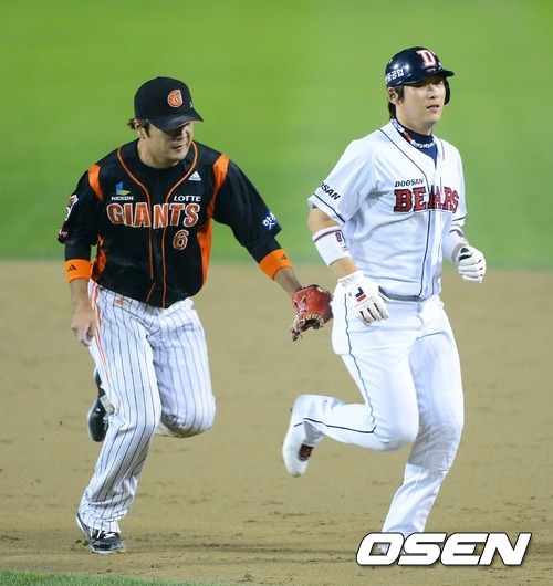4회말 1사 1루 최주환 타석때 1루 주자 이원석 2루 도루를 하였으나 문규현 유격수에게 태그아웃 처리되고 있다.